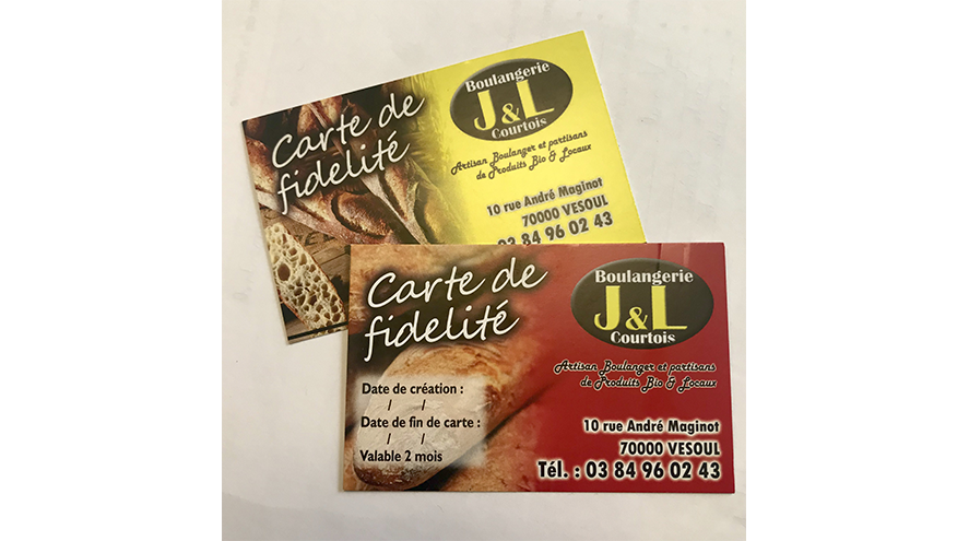 La Boulangerie-Pâtisserie Courtois vous propose deux cartes de fidélité au choix : la carte rouge, qui vous offre 5 € de remise hors promotion sur les pains, viennoiseries et pâtisseries dès votre 11ᵉ achat (minimum d'achat de 5 €), et la carte jaune, qui vous accorde 7 € de remise hors promotion sur les formules salades, sandwichs et plats du jour dès votre 11ᵉ achat (minimum d'achat de 5 €) ; n'hésitez pas à demander votre carte lors de votre passage en caisse !